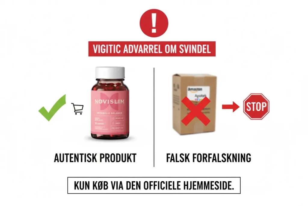 WICHTIGER HINWEIS: På grund af den enorme efterspørgsel i hele Norden, er der fundet forfalskede versioner af NoviSlim på Amazon, eBay og i uautoriserede helsekostbutikker. Disse versioner er usikre og dækkes ikke af garantien.